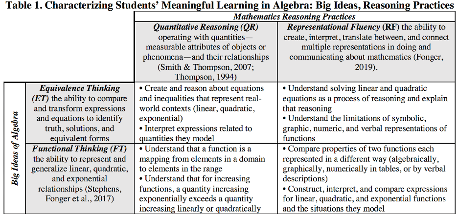 The goal of the meaningful math learning research group is to understand and support students’ reasoning with multiple representations of big mathematical ideas including equivalence, equation solving, and functions (Table 1). We investigate constructs of representational fluency, quantitative reasoning, equivalence thinking, and functional thinking. We ask: