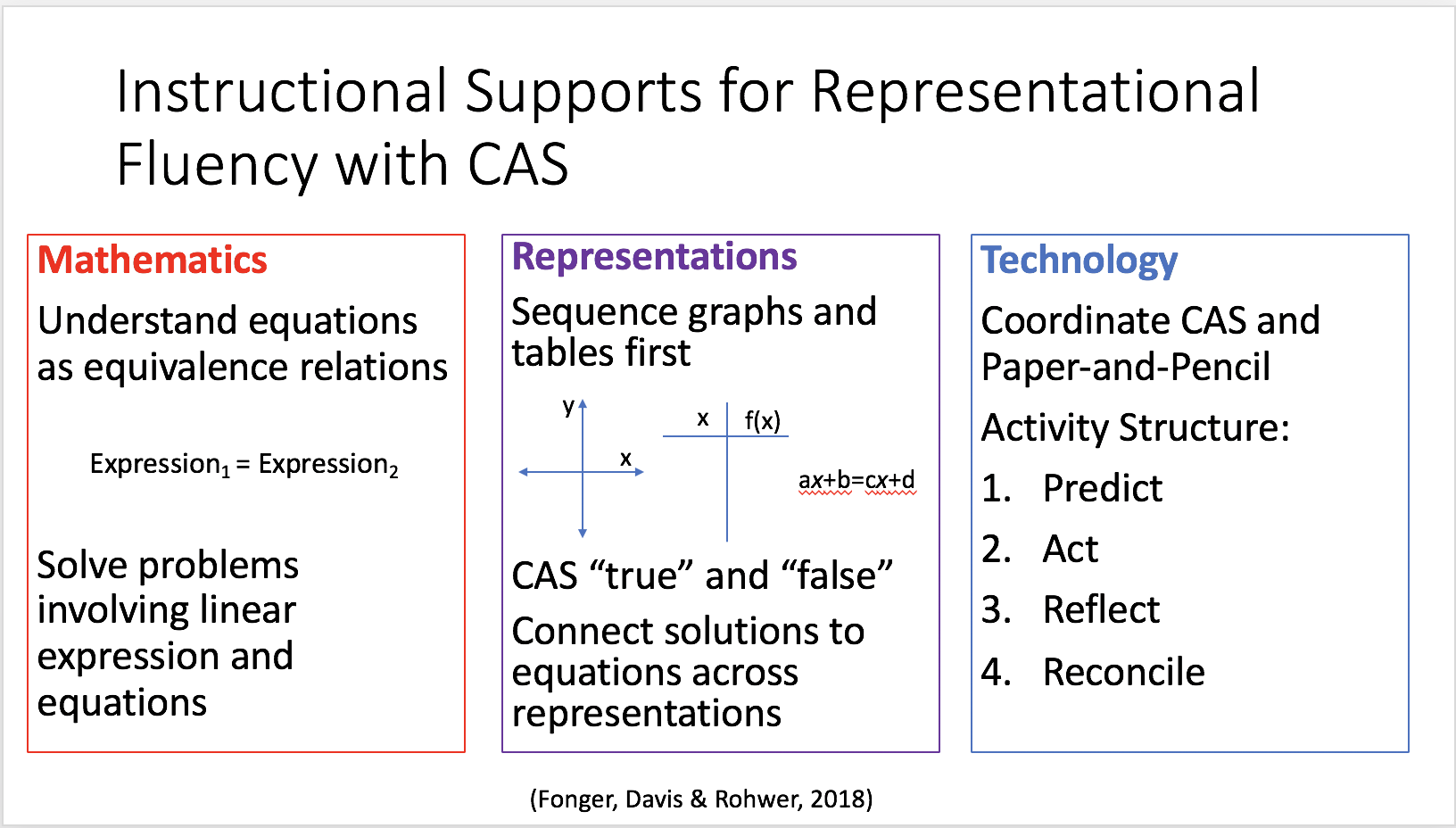 Fonger, N. L., Davis, J. D., & Rohwer, M. L. (2018). Instructional supports for representational fluency in solving linear equations with computer algebra systems and paper-and-pencil. School Science and Mathematics. https://doi:10.1111/ssm.12256