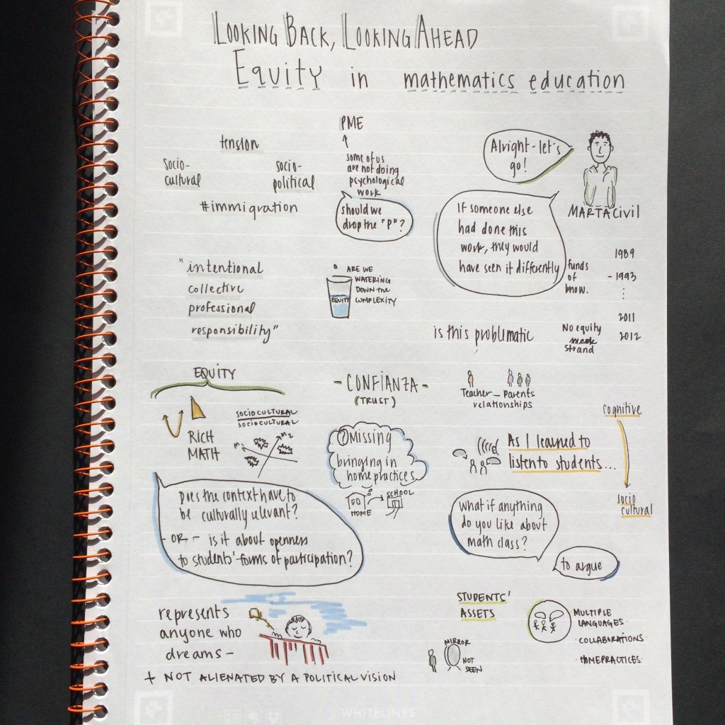 Here is a sample collection of Sketchnotes I created to capture themes expressed in a recent conference (PME-NA 40, November 2018). They focus on student experience, equity in mathematics education, the nature of mathematics, and student identity.